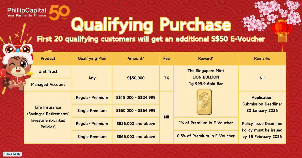 Take charge of your financial journey and usher in the Year of the Horse From 1 January 2026 to 30 January 2026, both dates inclusive, enjoy exclusive e-vouchers of up to S$120, and receive a 1g 999.9 Lion Bullion, a new line of investment-grade gold bars launched by The Singapore Mint when you make a qualifying purchase.