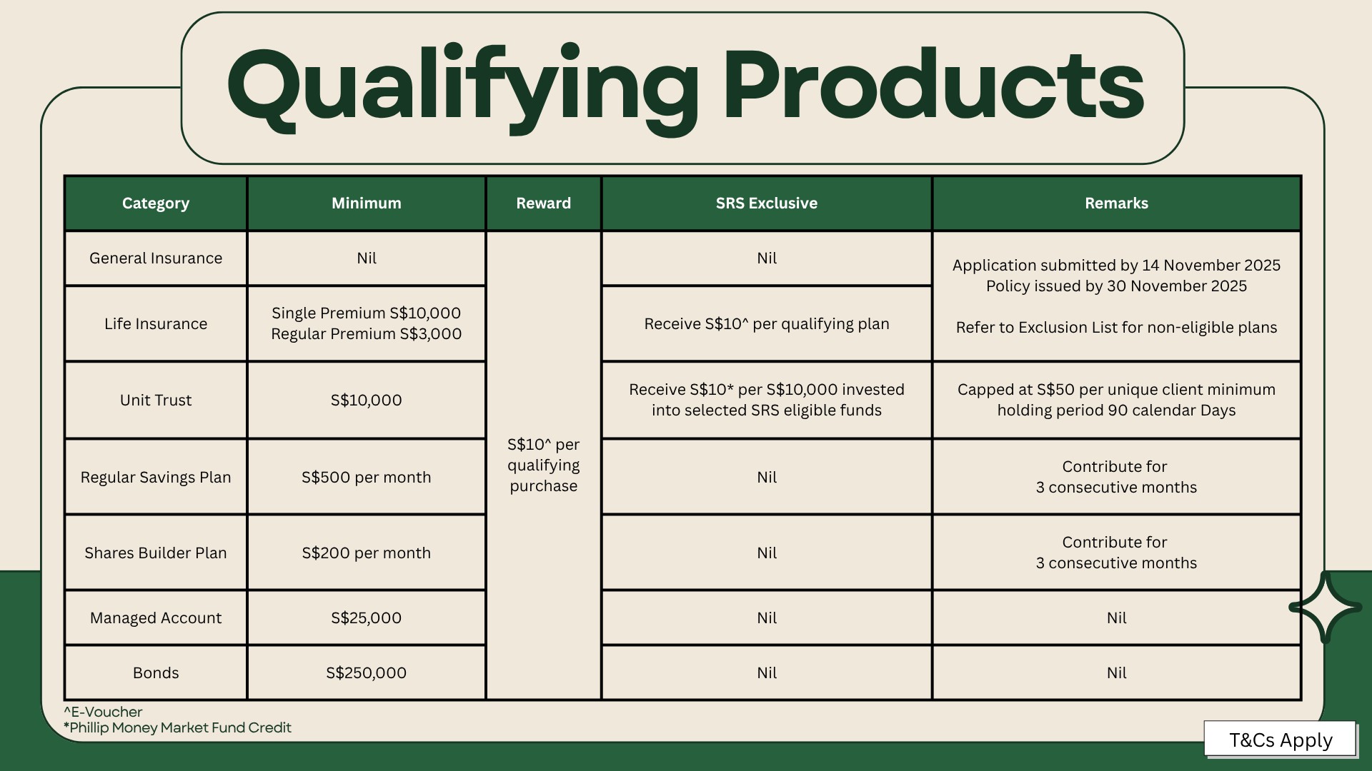 Product Category | Minimum Amount | Reward | SRS Exclusive | Remarks |