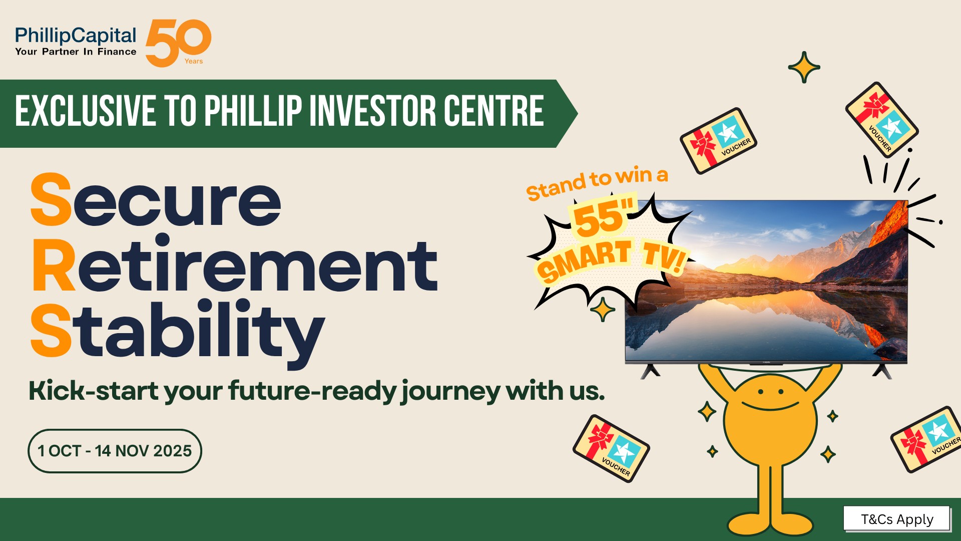 From 1 Oct 2025 till 14 Nov 2025, both dates inclusive, join us at Phillip Investor Centre and stand a chance to win a 55” Smart TV when you participate in our Secure-Retirement-Stability(SRS) campaign!